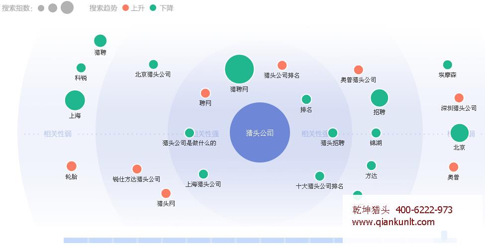 北京知名獵頭公司乾坤獵頭通過百度大數(shù)據(jù)平臺(tái),分析了全國(guó)范圍內(nèi)的百度用戶在2015-11-09 至 2015-11-15期間,通過百度搜索關(guān)鍵詞獵頭公司一詞的需求情況,得出的上圖,圖中大圓表示強(qiáng)烈,小圓表示相反,綠色表示在下降,紅色表示在上升,越靠近中間獵頭公司一詞,相關(guān)性越強(qiáng),反之越弱。